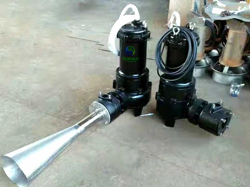 潛水泵工作后產(chǎn)生的水流經(jīng)過噴嘴后形成高速水流,在混合室內(nèi)由于噴嘴周圍形成負(fù)壓而吸入空氣,空氣經(jīng)喉管與高速水流相遇,被撕碎成微氣泡與水形成氣水混合液,高速噴射而出,夾帶大量氣泡的水流在交大的范圍內(nèi)產(chǎn)生強(qiáng)有力的單向液流,從而具曝氣、攪拌、推流一體,對(duì)推流生化反應(yīng)池更為適用,同時(shí)在曝氣過程中,氣軸功率的隨潛沒深度的變化而變化,可以在水位變化較大的池中運(yùn)用。